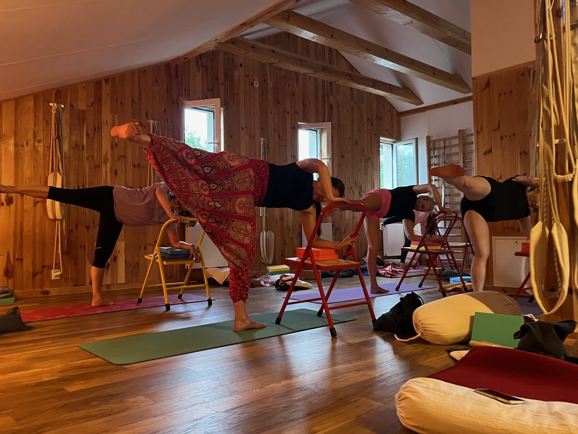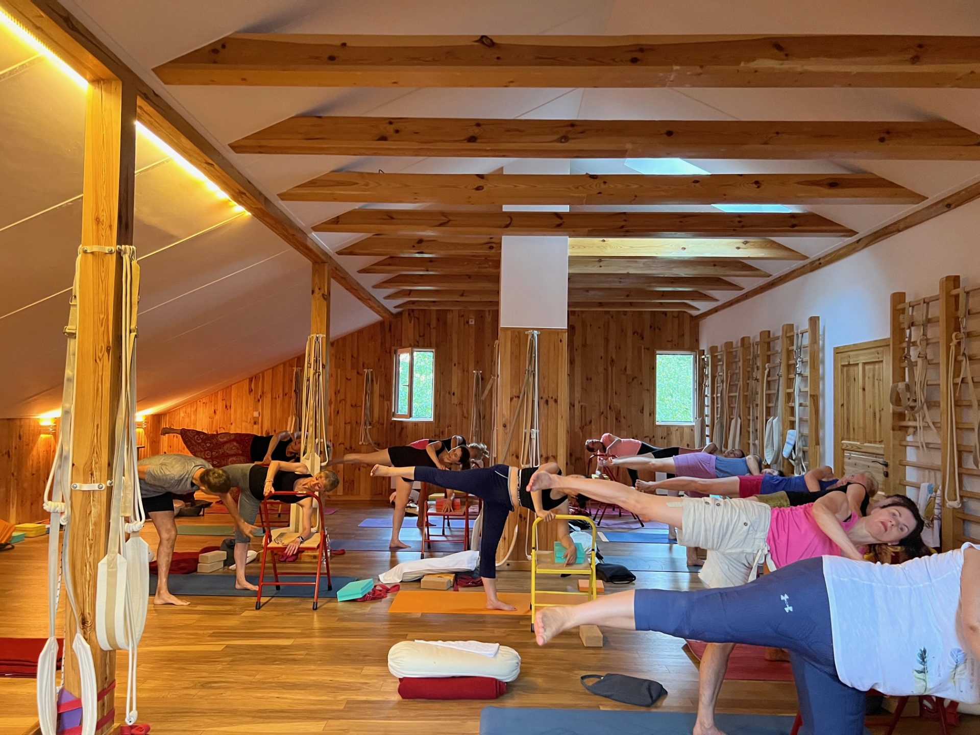 Dom Warsztatowy w Jaświłach przeznaczony jest wyłącznie do praktyki jogi. Ćwiczymy na przestronnej sali na poddaszu – 100 m2 z podgrzewaną podłogą, o wysokości 4 m ! Sala jest w pełni wyposażona w pomoce do jogi: drabinki , pasy do jogi , pianki, klocki, koce, wałki, krzesła, paski.