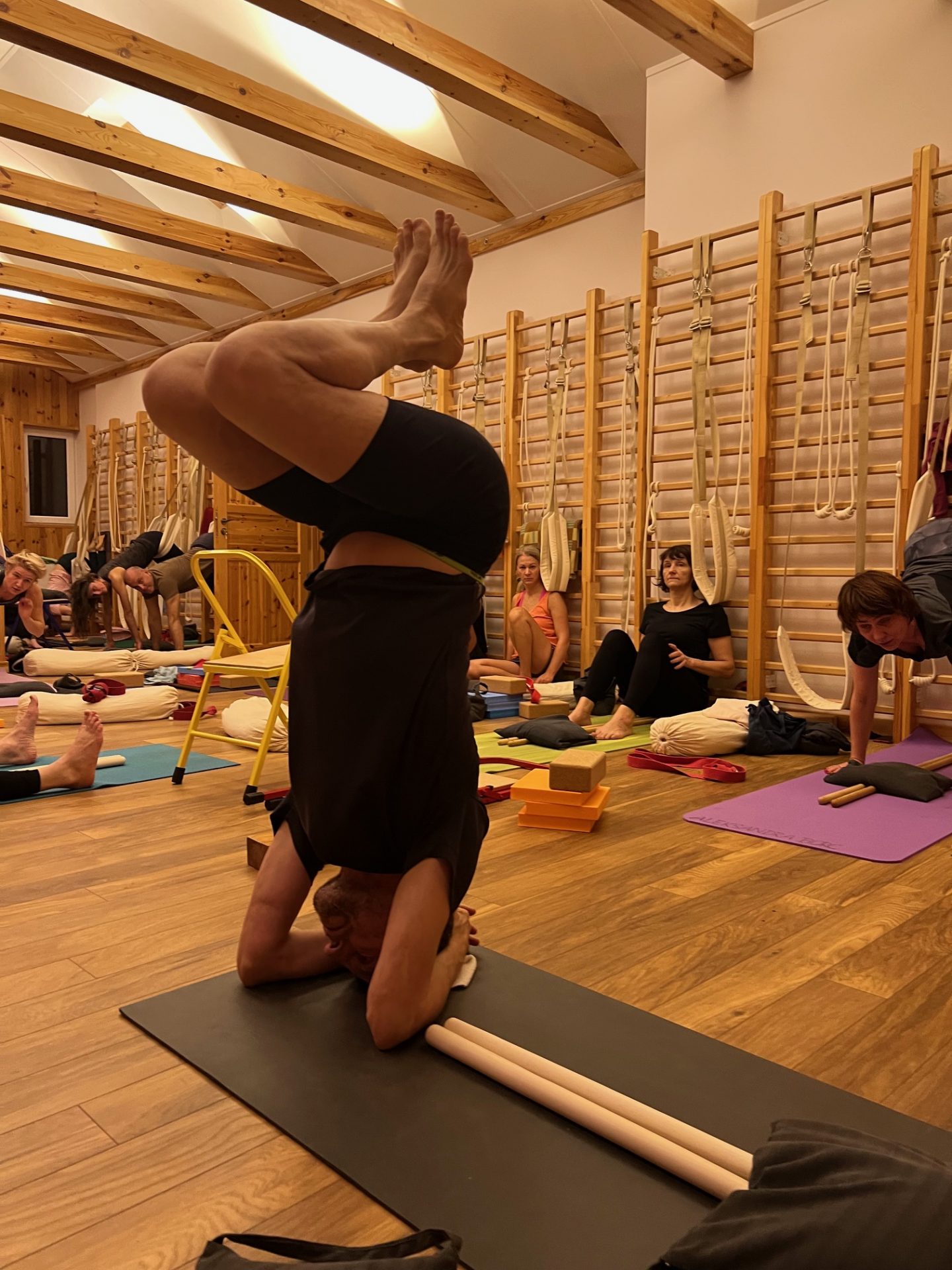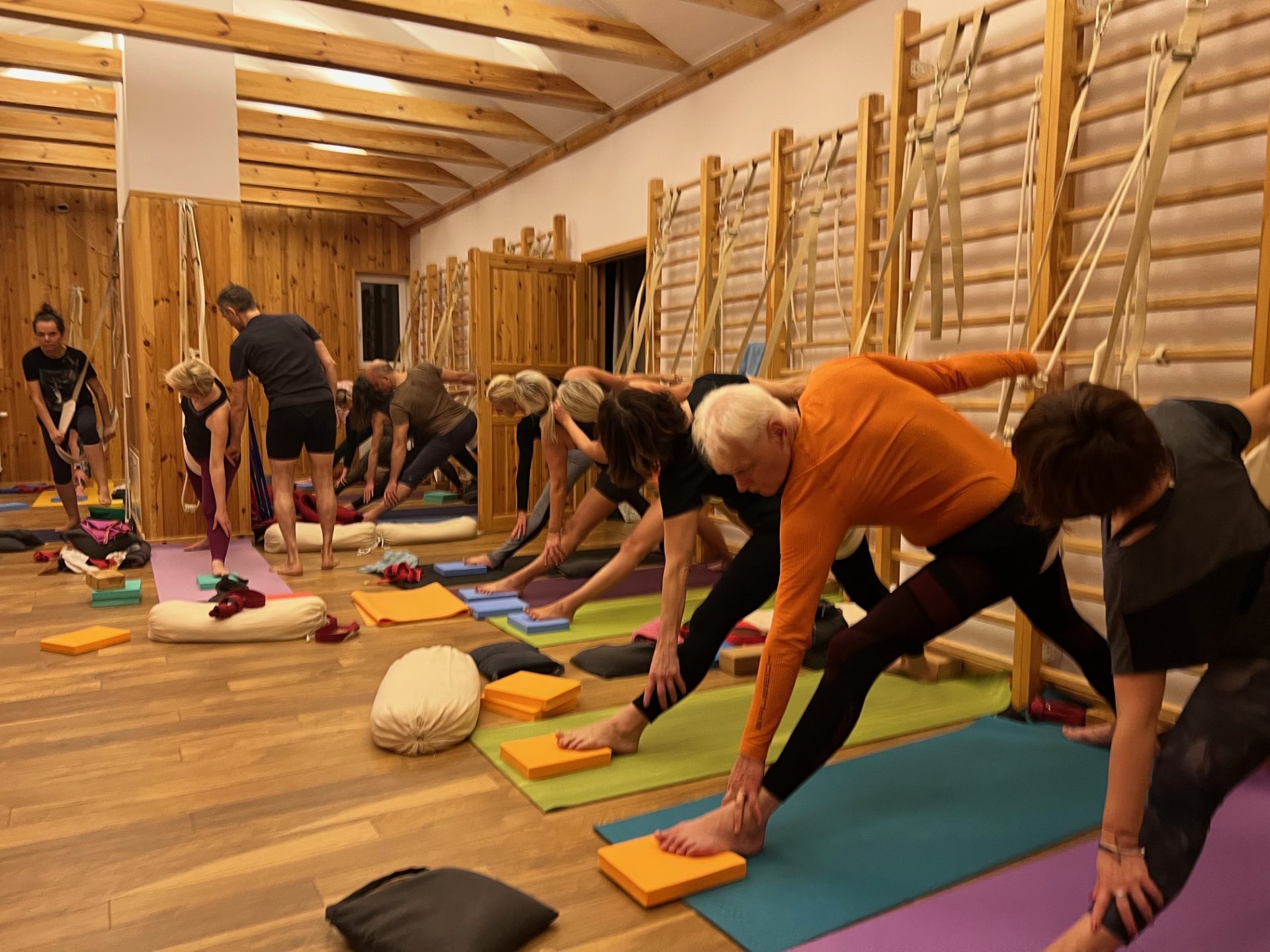 Dom Warsztatowy w Jaświłach  przeznaczony jest wyłącznie do praktyki jogi.  Ćwiczymy na przestronnej sali na poddaszu – 100 m2 z podgrzewaną podłogą, o wysokości 4 m ! Sala jest w pełni wyposażona w pomoce do jogi:  drabinki , pasy do jogi , pianki, klocki, koce, wałki, krzesła, paski.